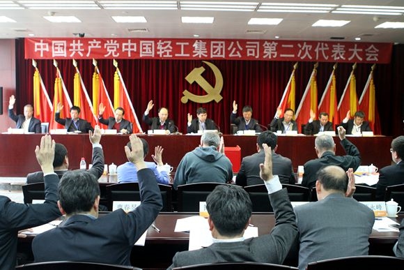 代表們舉手表決通過大會《中國共產(chǎn)黨中國輕工集團(tuán)公司第二次代表大會選舉辦法》