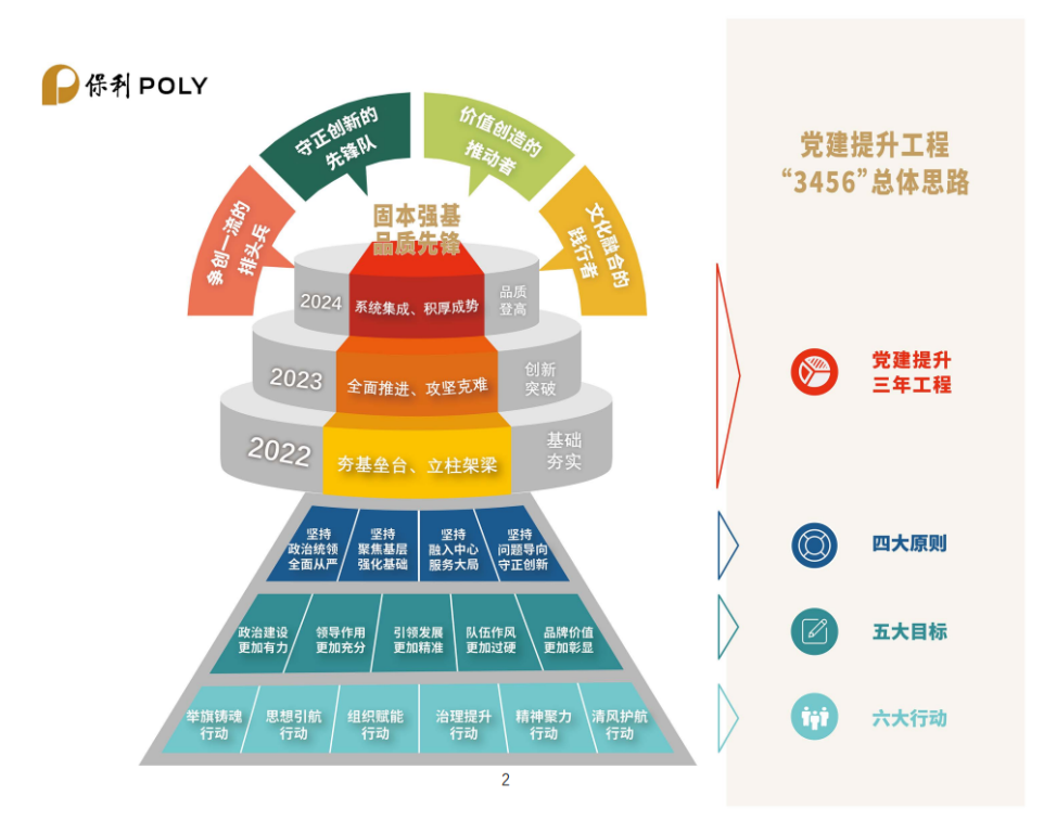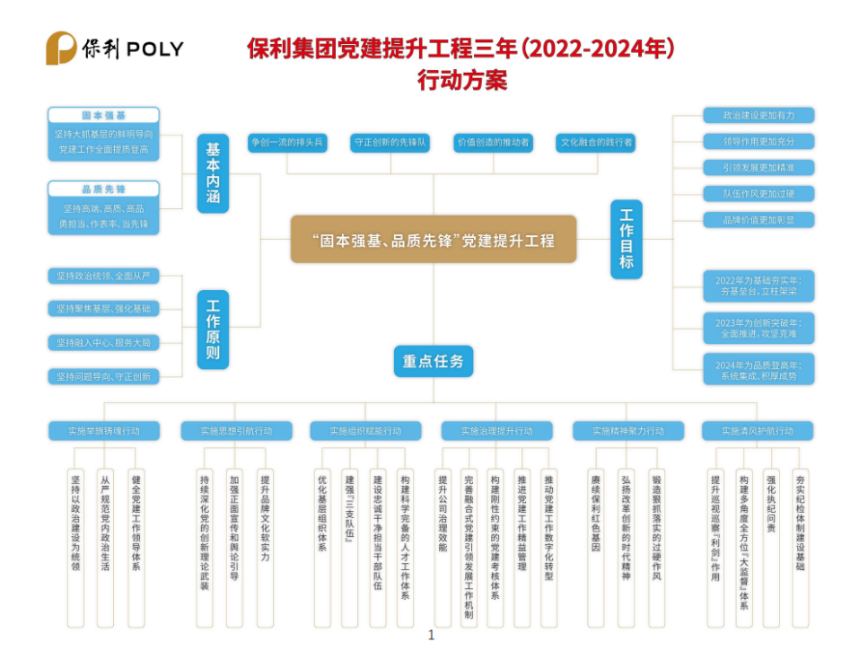 編者按:12月22日,保利集團(tuán)在京召開學(xué)習(xí)貫徹黨的十九屆六中全會(huì)精神暨2022年度黨建工作會(huì),會(huì)上正式發(fā)布了《保利集團(tuán)“固本強(qiáng)基、品質(zhì)先鋒”黨建提升工程三年(2022-2024年)行動(dòng)方案》(以下簡(jiǎn)稱“《方案》”)。為貫徹落實(shí)《方案》,保利中輕迅速組織傳達(dá)學(xué)習(xí),并特別策劃《黨建提升 保利中輕在行動(dòng)》專題,計(jì)劃持續(xù)定期報(bào)道保利中輕貫徹落實(shí)情況,旨在帶領(lǐng)全體干部員工一同認(rèn)真學(xué)習(xí)、深刻領(lǐng)會(huì),切實(shí)落實(shí)《方案》要求,突出抓基層強(qiáng)基礎(chǔ),推動(dòng)黨建工作提質(zhì)增效、邁上新臺(tái)階,以高質(zhì)量黨建引領(lǐng)保障保利中輕高質(zhì)量發(fā)展,為保利集團(tuán)建設(shè)世界一流,追求卓越,貢獻(xiàn)中輕力量。今天第一期,一起來學(xué)《方案》的主要內(nèi)容。