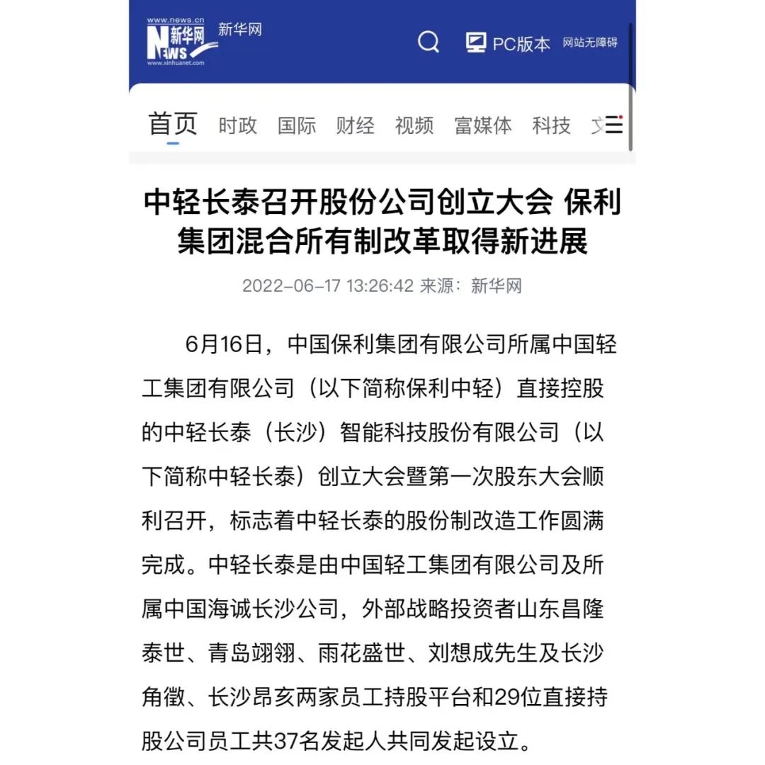 新華網(wǎng)報(bào)道“中輕長(zhǎng)泰召開股份公司創(chuàng)立大會(huì)”